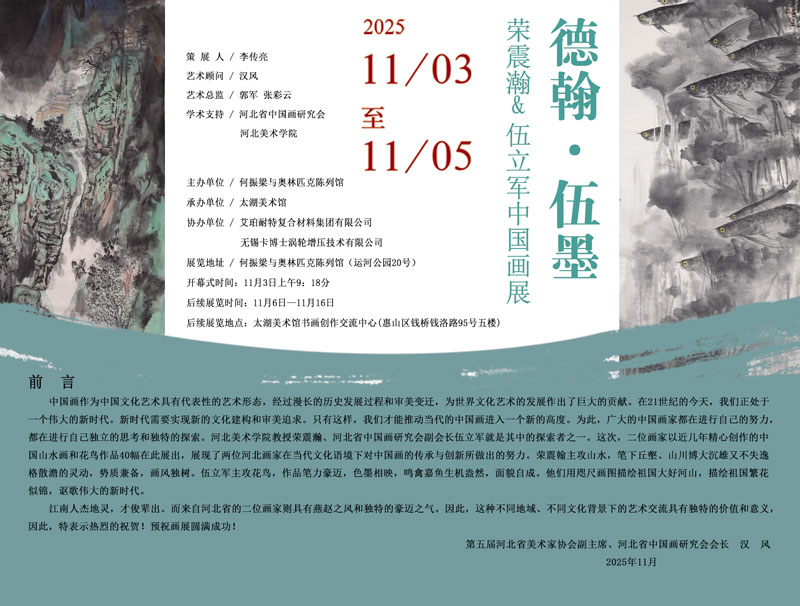 中国画作为中国文化艺术具有代表性的艺术形态,经过漫长的历史发展过程和审美变迁,为世界文化艺术的发展作出了巨大的贡献。在21世纪的今天,我们正处于一个伟大的新时代。新时代需要实现新的文化建构和审美追求。只有这样,我们才能推动当代的中国画进入一个新的高度。为此,广大的中国画家都在进行自己的努力,都在进行自己独立的思考和独特的探索。河北美术学院教授荣震瀚、河北省中国画研究会副会长伍立军就是其中的探索者之一。这次,二位画家以近几年精心创作的中国山水画和花鸟作品40幅在此展出,展现了两位河北画家在当代文化语境下对中国画的传承与创新所做出的努力。荣震翰主攻山水,笔下丘壑、山川博大沉雄又不失逸格散澹的灵动,势质兼备,画风独树。伍立军主攻花鸟,作品笔力豪迈,色墨相映,鸣禽嘉鱼生机盎然,面貌自成。他们用咫尺画图描绘祖国大好河山,描绘祖国繁花似锦,讴歌伟大的新时代。 江南人杰地灵,才俊辈出。而来自河北省的二位画家则具有燕赵之风和独特的豪迈之气。因此,这种不同地域、不同文化背景下的艺术交流具有独特的价值和意义,因此,特表示热烈的祝贺!预祝画展圆满成功! 第五届河北省美术家协会副主席、河北省中国画研究会会长汉风 2025年11月
